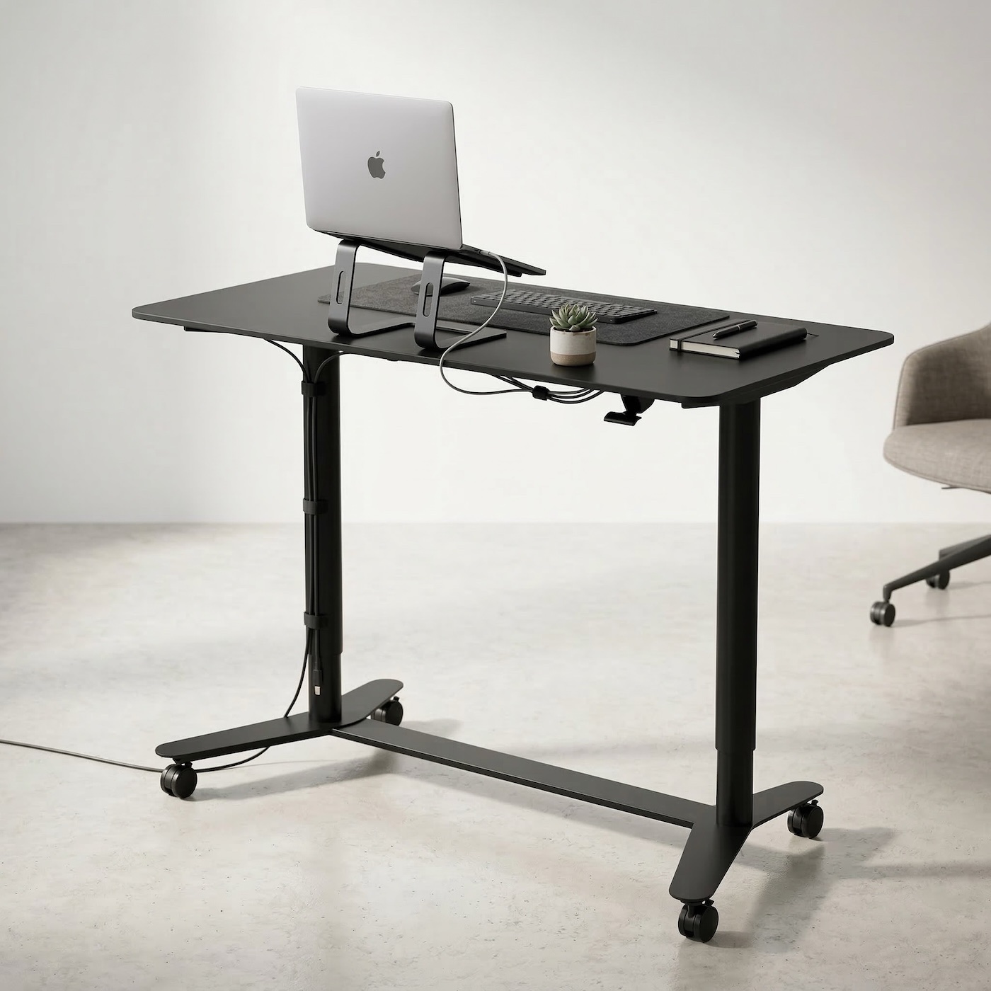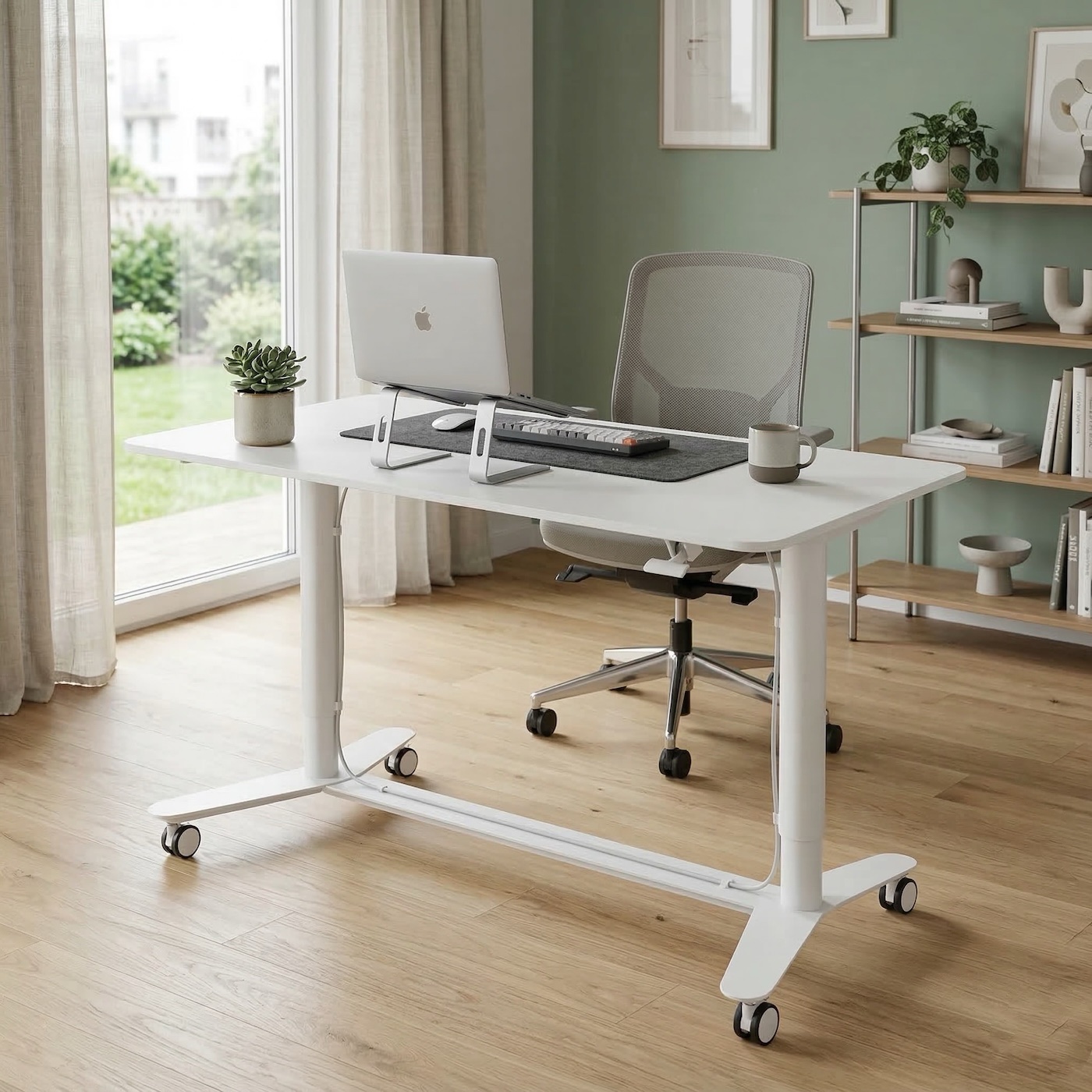 Mechanizm regulacji działa pneumatycznie, co oznacza pełną niezależność od zasilania elektrycznego — nie są potrzebne żadne kable ani dostęp do gniazdka. Wysokość można zmieniać płynnie i precyzyjnie, dokładnie wtedy, gdy jest to potrzebne. Biurko wyposażono również w kółka z hamulcami, które ułatwiają jego przestawianie, a jednocześnie pozwalają stabilnie zablokować je w wybranym miejscu. Dzięki temu PD-2-120 można bez wysiłku przesunąć podczas sprzątania czy reorganizacji przestrzeni, co docenią zwłaszcza osoby dbające o dokładną czystość, w tym alergicy.