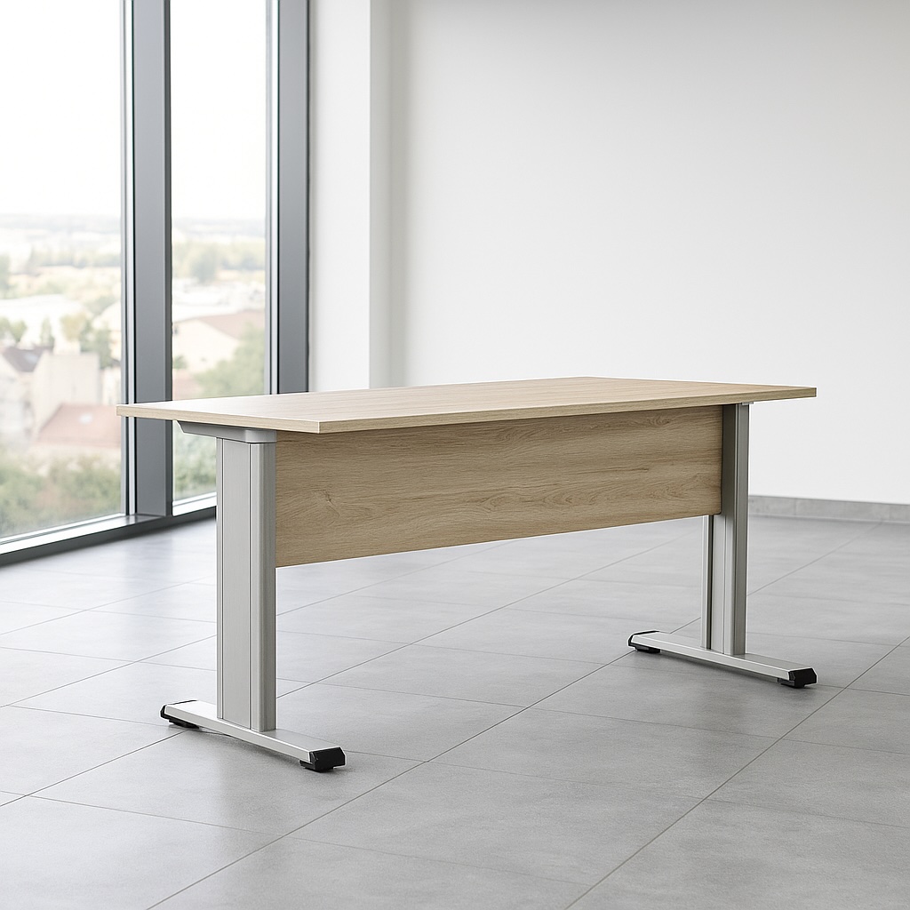 Blat stołu: Blat prosty stołu wykonany jest z płyty wiórowej dwustronnie melaminowanej w klasie E-1, co oznacza, że jest nietoksyczny i bezzapachowy. Blat jest dodatkowo oklejony obrzeżem ABS o grubości 2 mm, pasującym do koloru płyty. Kleje używane do oklejenia blatów są klejami poliuretanowymi, co zapewnia wodoodporność dzięki Technologii PUR.