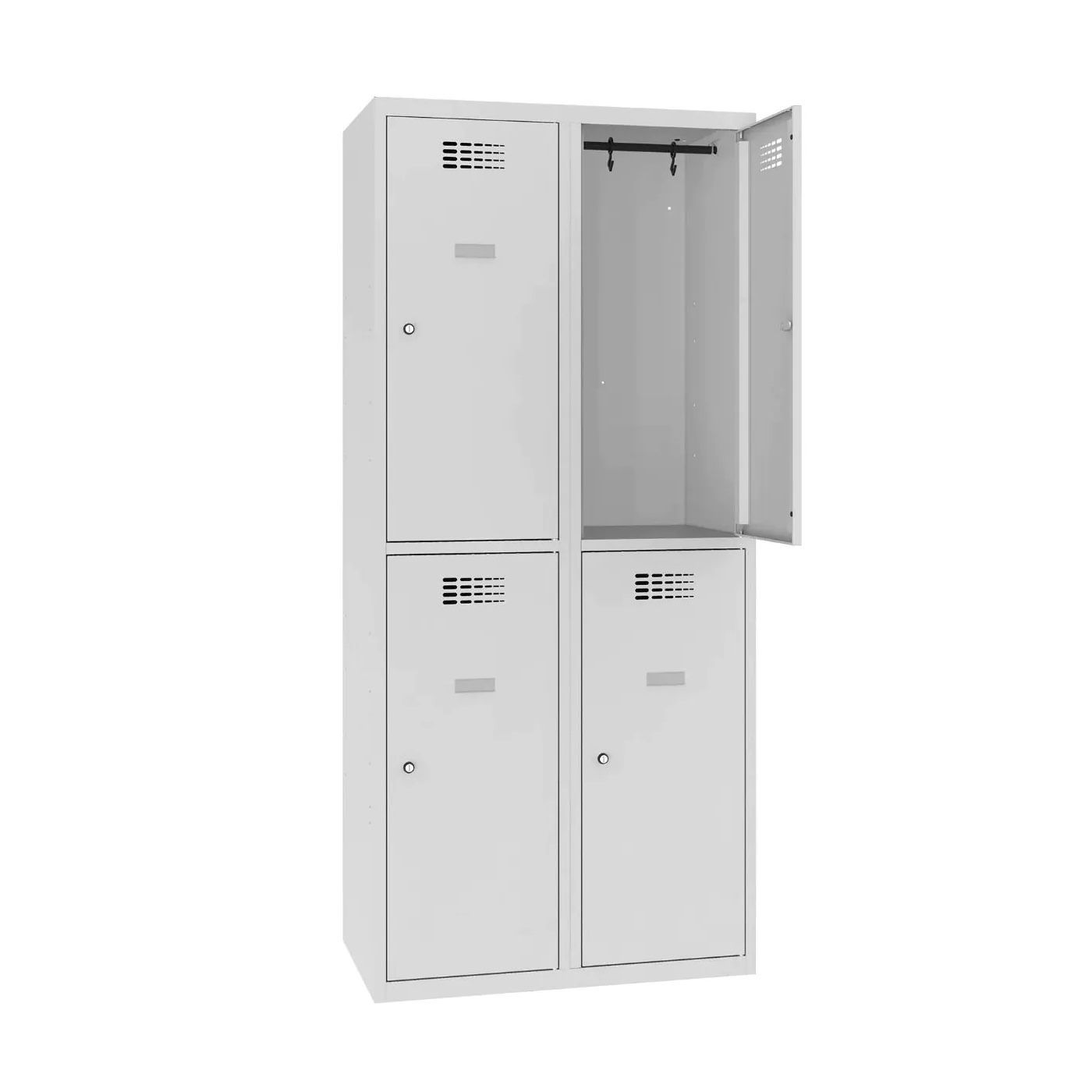 Wentylacja szafy ubraniowej jest zapewniana poprzez system otworów, a perforacja o nowoczesnym designie, zastrzeżona znakiem przemysłowym, umożliwia swobodną cyrkulację powietrza.