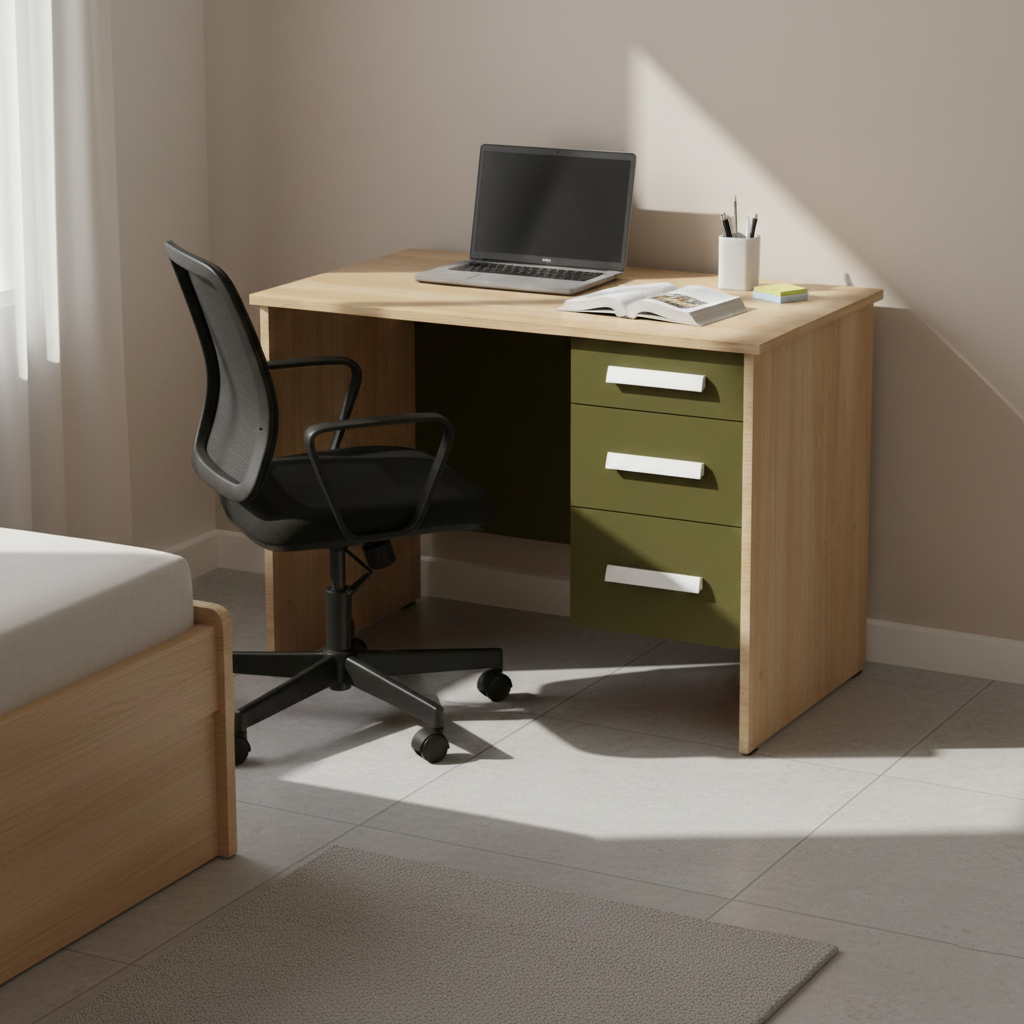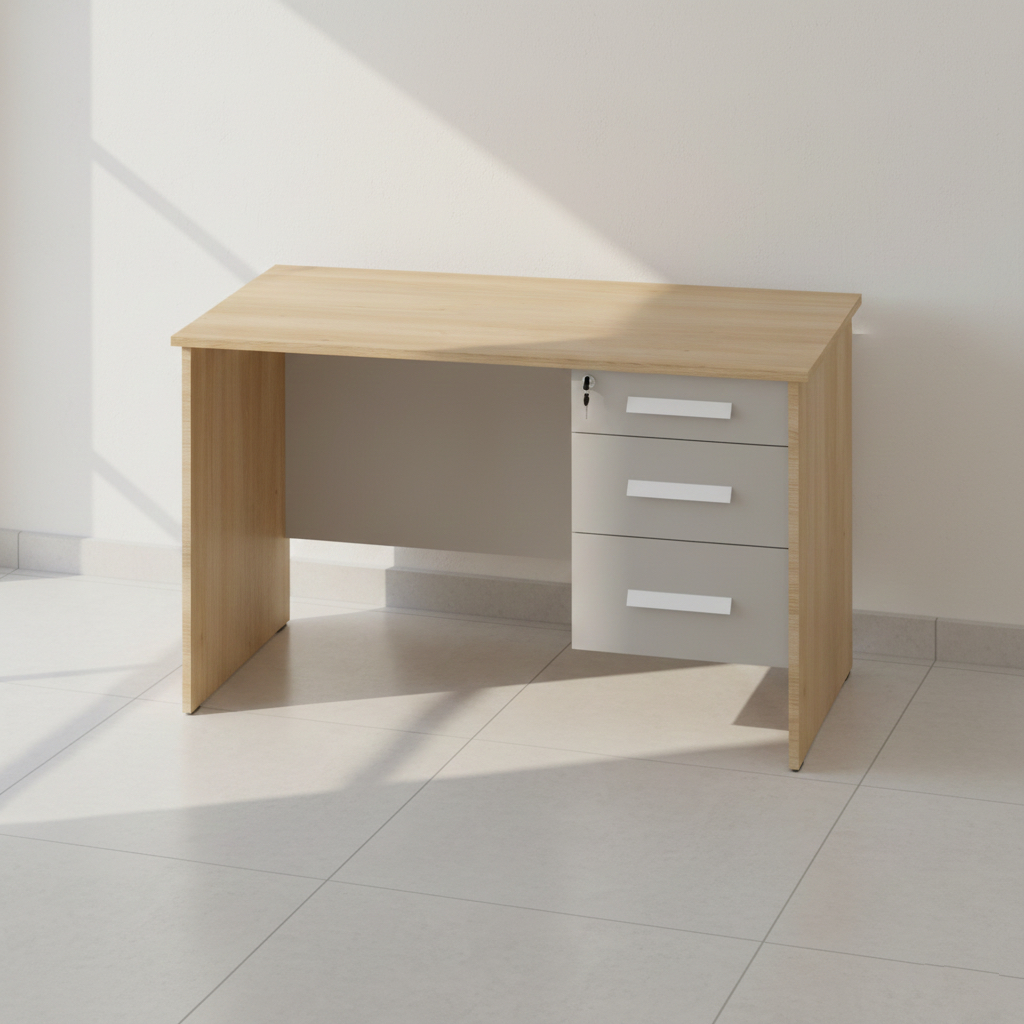 Praktyczne i wygodne biurko akademickie stworzone z myślą o nauce, pracy i codziennym użytkowaniu. Szeroki blat zapewnia komfortową przestrzeń na komputer, zeszyty i akcesoria, a solidna konstrukcja gwarantuje stabilność przez lata. Wyposażone w kontener z trzema szufladami z zamkiem centralnym do bezpiecznego przechowywania dokumentów, elektroniki czy rzeczy osobistych.