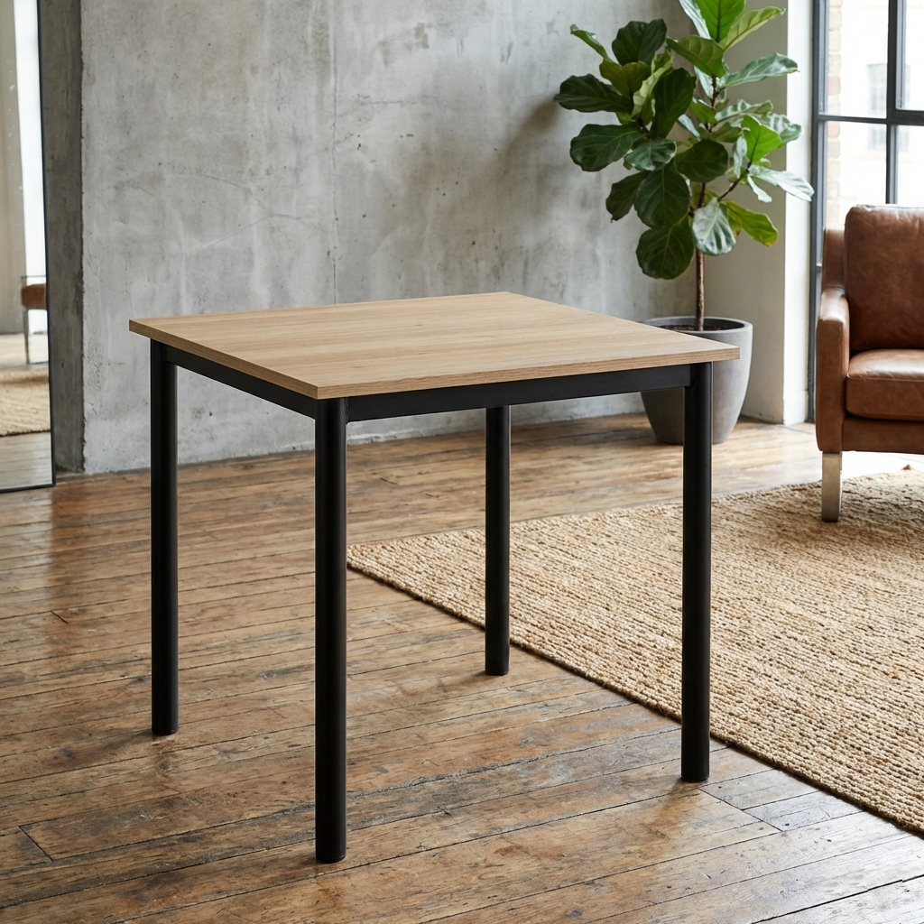 Blat stołu wykonany jest z trwałej płyty meblowej, dostępnej w różnych kolorach, co pozwala łatwo dopasować go do charakteru wnętrza. Do wyboru są różne warianty stelaża – metalowe o nowoczesnym, solidnym charakterze lub drewniane, nadające całości bardziej naturalny wygląd – wszystkie zapewniają stabilność i komfort codziennego użytkowania.
