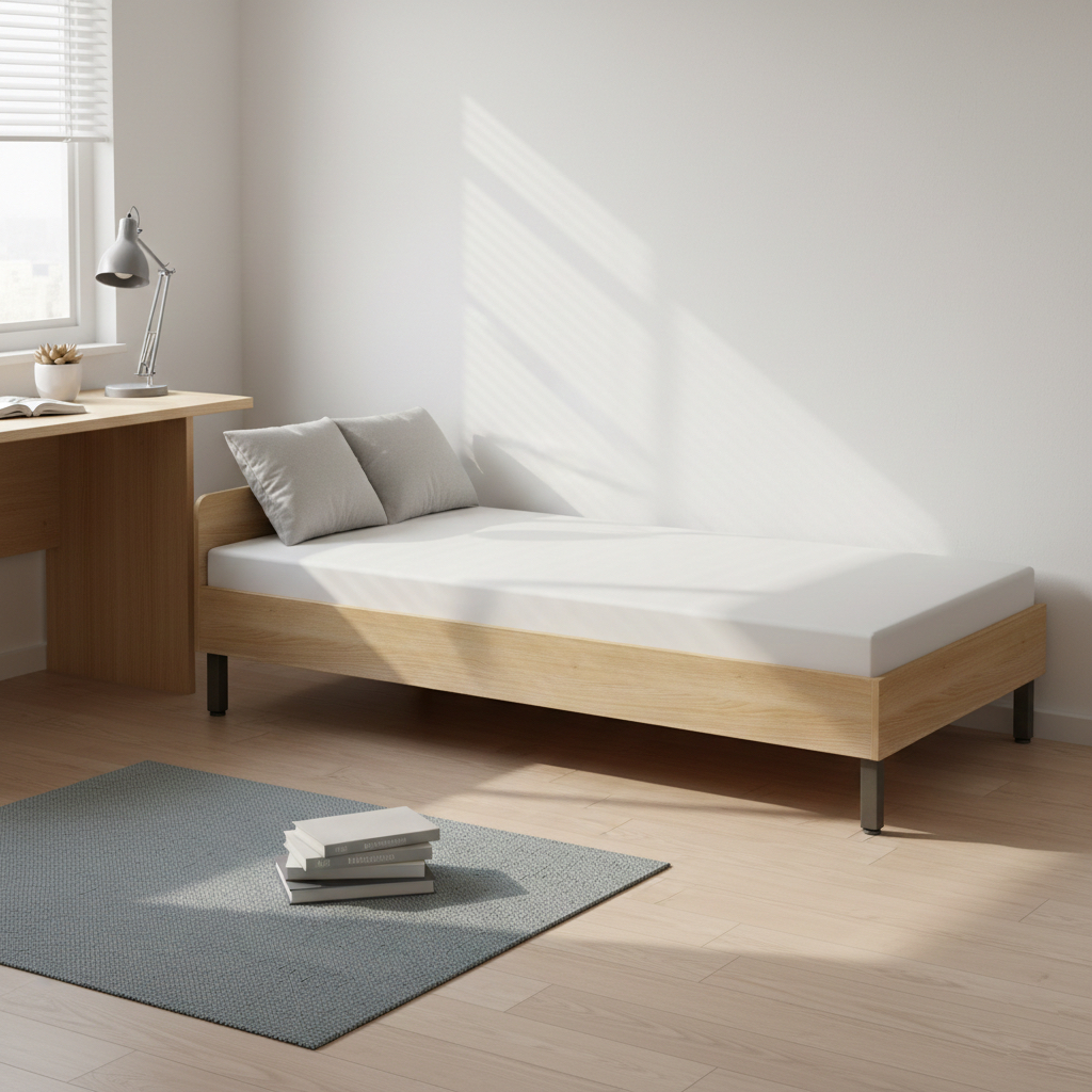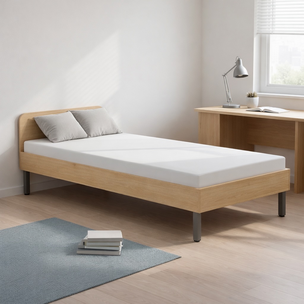 Łóżko EMI24 Steel to solidne i funkcjonalne rozwiązanie przeznaczone do akademików, internatów oraz mieszkań studenckich. Prosta konstrukcja, połączenie dekoru drewna z metalowym stelażem oraz minimalistyczny design sprawiają, że mebel dobrze sprawdza się w nowoczesnych i praktycznych przestrzeniach.