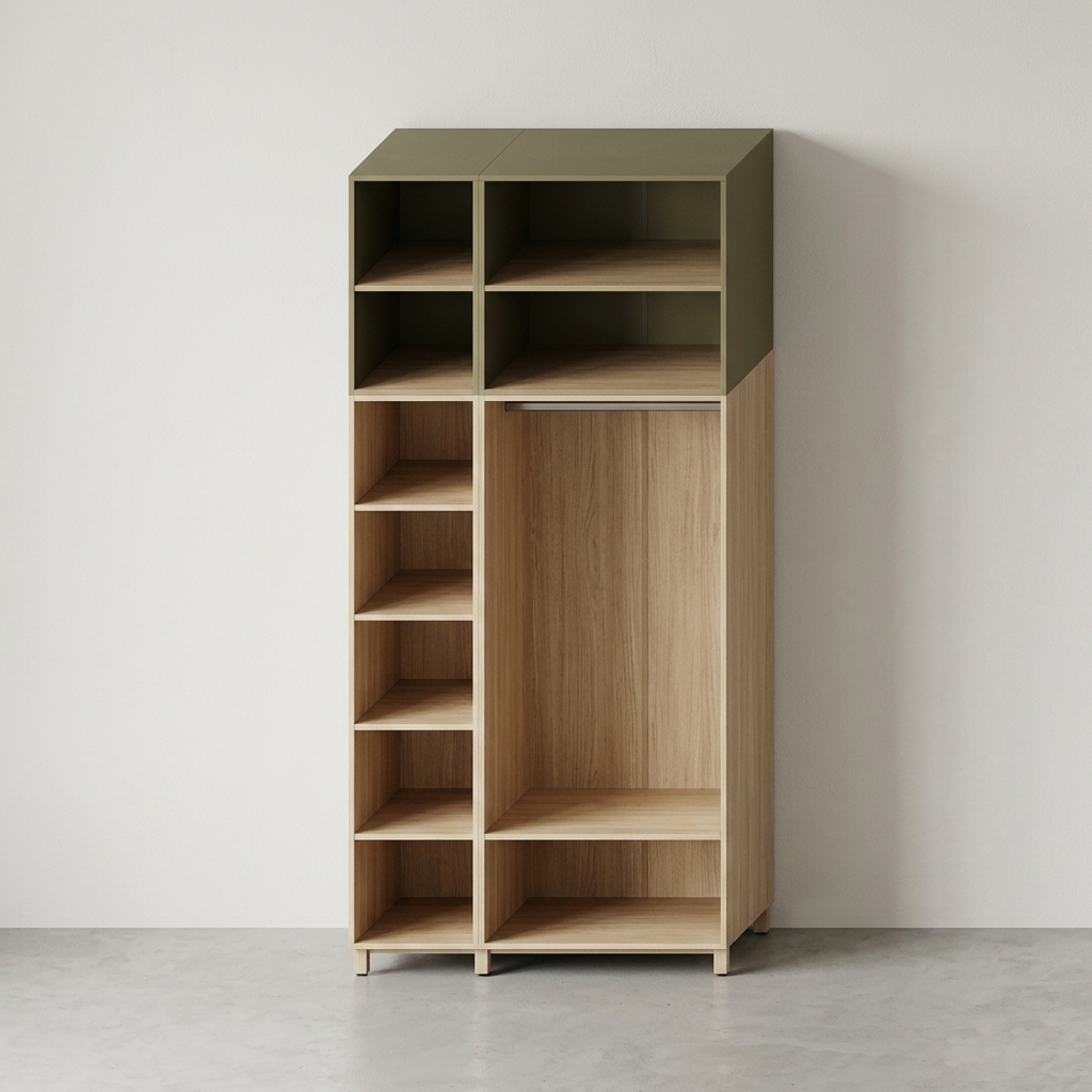 Szafa dostarczana jest w czterech elementach: lewa góra, lewa dół, prawa góra oraz prawa dół. Dzięki takiej konstrukcji możliwe jest ustawienie szafy w konfiguracji lewej lub prawej strony, co pozwala dopasować układ wnętrza do potrzeb oraz układu pomieszczenia.