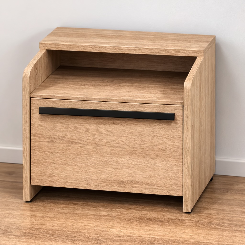 Prosta i uniwersalna konstrukcja sprawia, że szafki dobrze pasują zarówno do nowoczesnych, jak i klasycznych wnętrz. Blat górny zapewnia wygodne miejsce na lampkę lub budzik, a dodatkowe półki lub szuflady pozwalają utrzymać porządek i przechowywać rzeczy w zasięgu ręki.