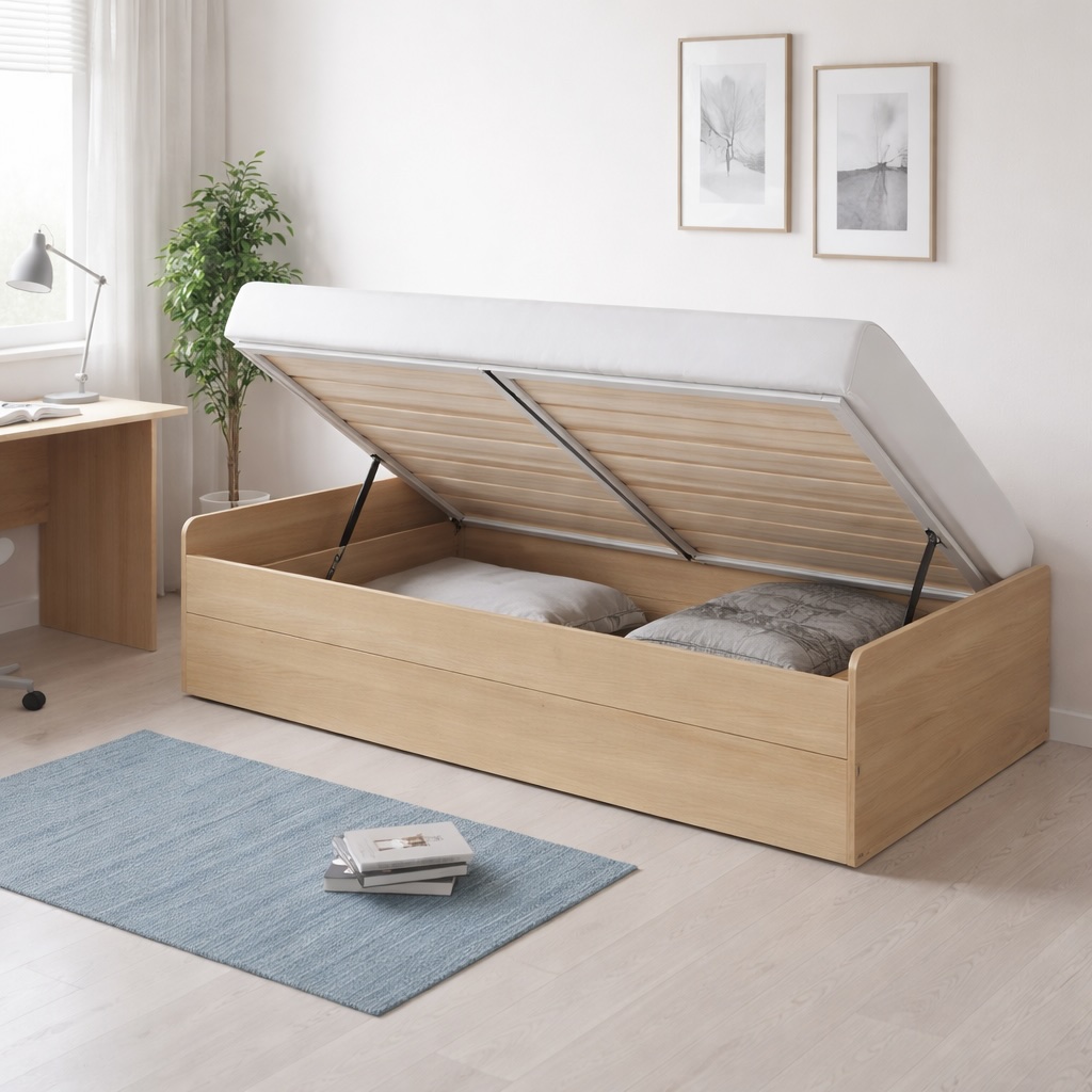 Takie rozwiązanie pozwala maksymalnie wykorzystać miejsce pod łóżkiem – idealnie sprawdzi się do przechowywania pościeli, walizek czy innych rzeczy studenckich.