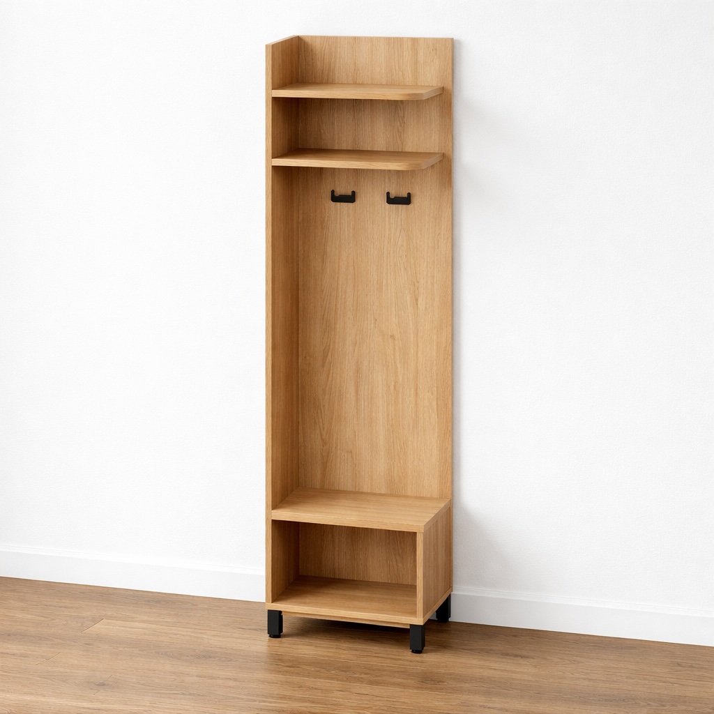 Centralna część wieszaka wyposażona jest w solidne haczyki na kurtki, bluzy lub torby. Nad nimi znajdują się dwie funkcjonalne półki na czapki, plecaki lub inne drobiazgi. Dolna część mebla tworzy wygodną wnękę, która świetnie sprawdzi się jako miejsce na buty, pudełka lub podręczne przedmioty.