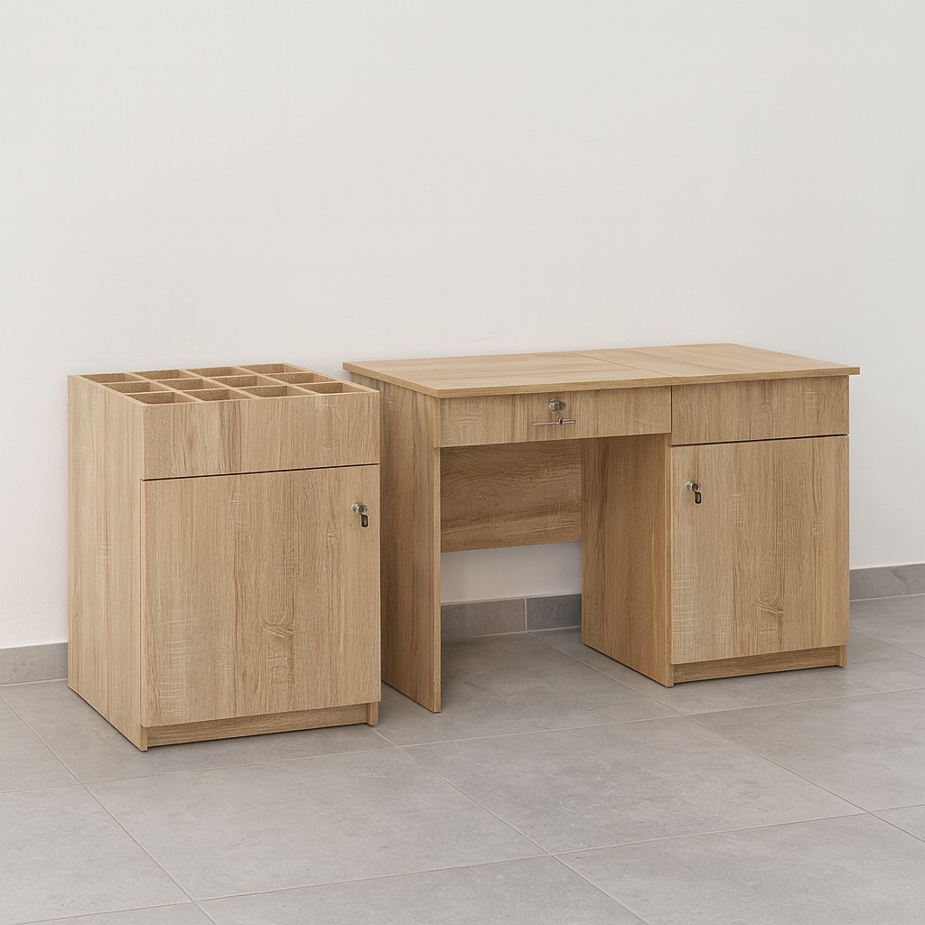 - Wyposażenie: pod blatem biurka szuflada i zamykane przegrody na kartoteki