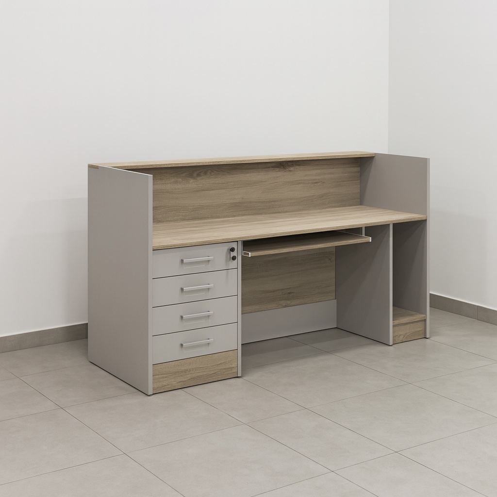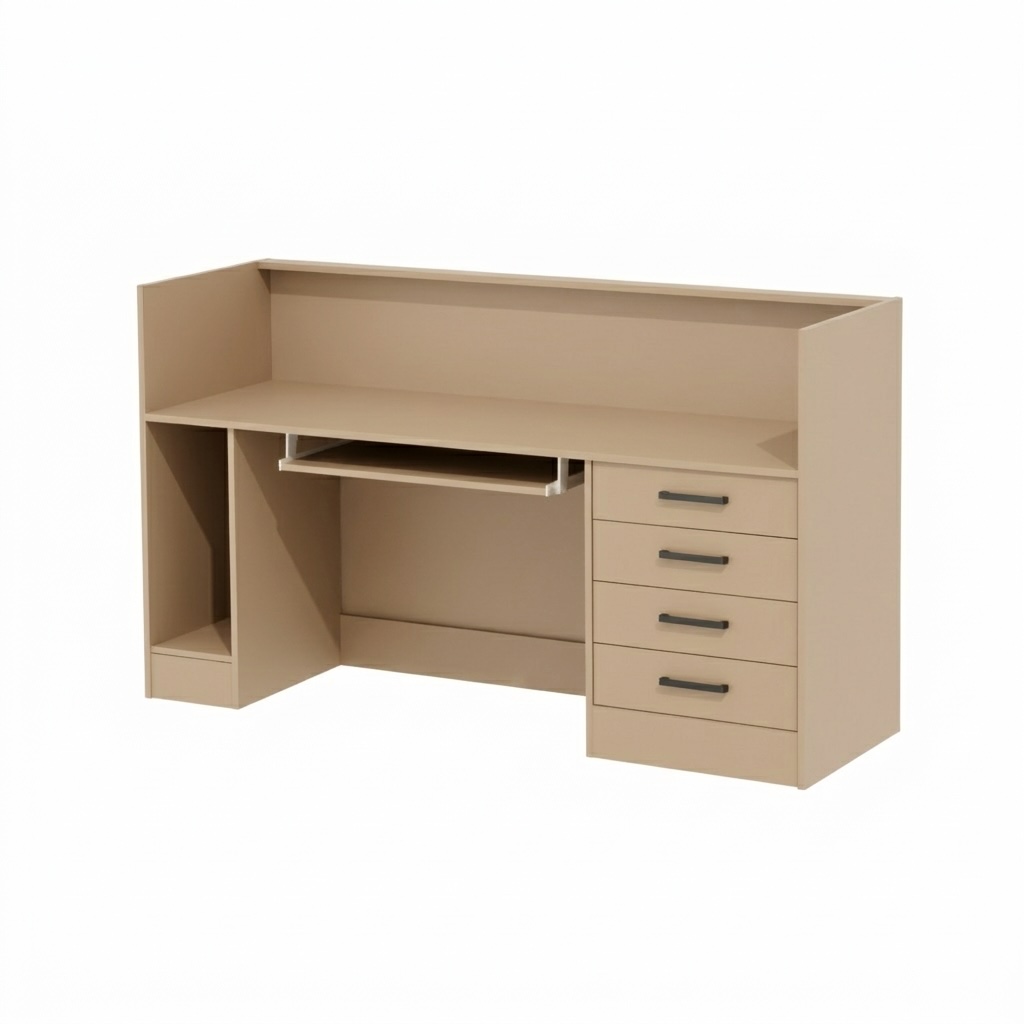 Lada EWA to funkcjonalny mebel do recepcji, bibliotek i biur, łączący prostą formę z praktycznymi rozwiązaniami. Posiada cztery pojemne szuflady, zamykane zamkiem centralnym, wysuwaną półkę na klawiaturę oraz przestronny blat roboczy z wysoką nadstawką od strony klienta. Dodatkowa wnęka umożliwia wygodne ustawienie sprzętu lub przechowywanie dokumentów. Wykonana z trwałej płyty laminowanej, dostępna w różnych wariantach kolorystycznych. Idealna do nowoczesnych przestrzeni obsługi klienta.