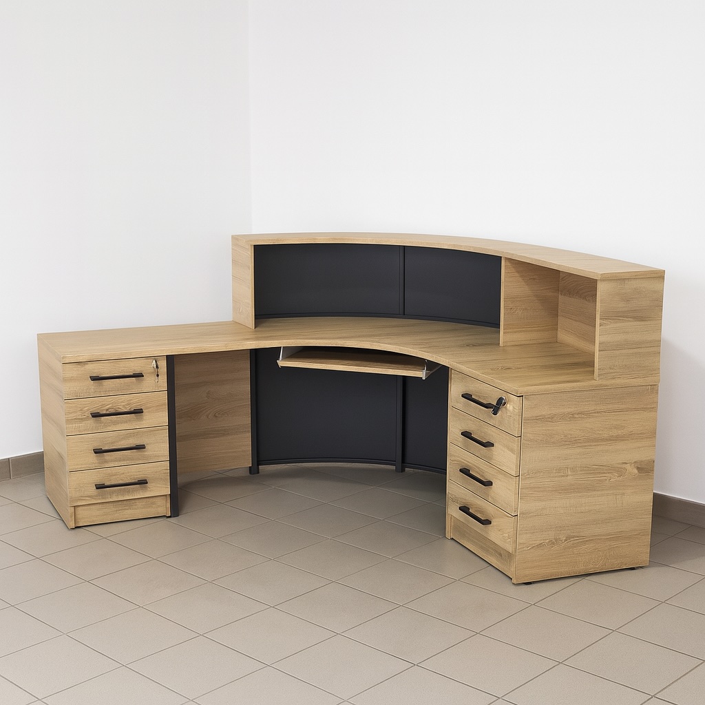 Ergonomiczny, narożny kształt lady ułatwia organizację pracy i pozwala efektywnie zagospodarować przestrzeń. Wysoka część frontowa zapewnia prywatność, a wysuwana półka na klawiaturę zwiększa komfort pracy przy komputerze. Lada wyposażona jest w osiem pojemnych szuflad, w tym jedną zamykaną na klucz, oraz praktyczną otwartą półkę na podręczne materiały lub dekoracje.