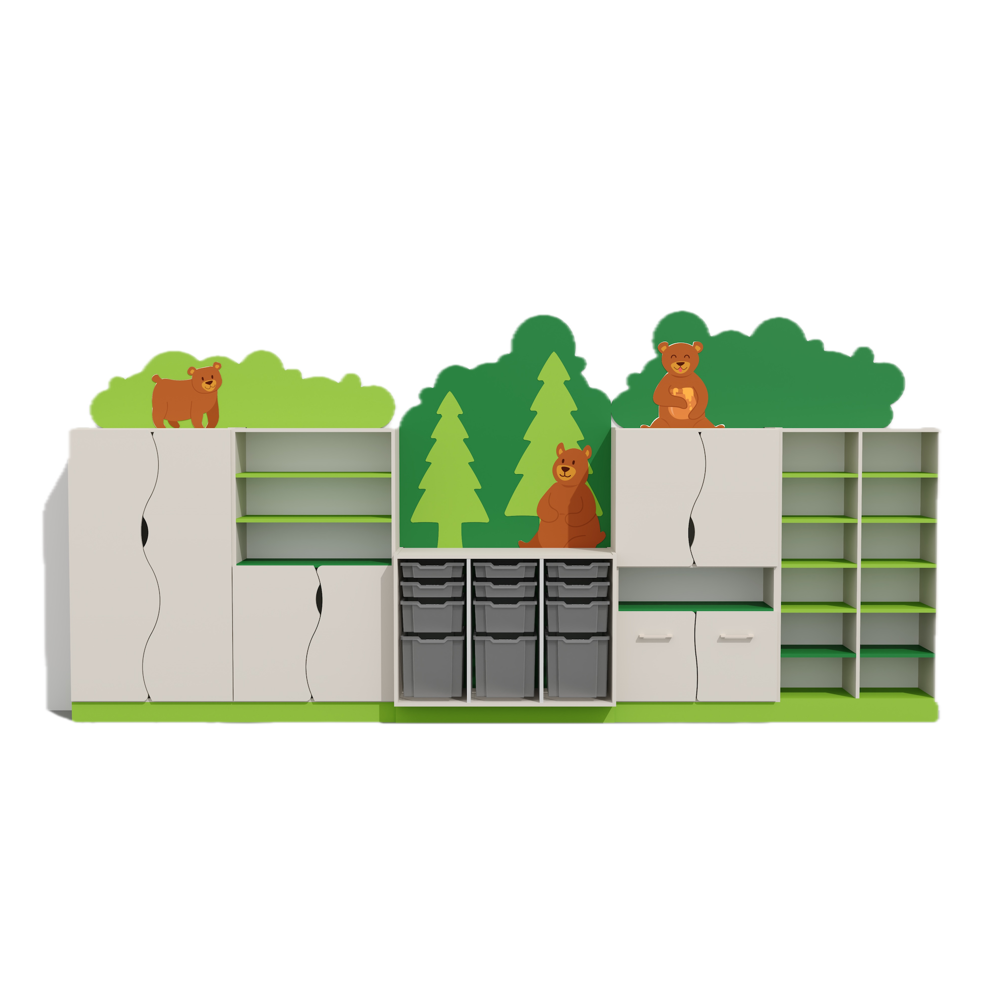Zestaw mebli „Las z misiami – Soft” został zaprojektowany z myślą o dzieciach, które potrzebują spokojnej, neutralnej przestrzeni sprzyjającej wyciszeniu i koncentracji. Delikatne, stonowane fronty w odcieniach cashmere lub popielu tworzą harmonijne tło, łagodne dla zmysłów najmłodszych. Taka kolorystyka redukuje nadmiar bodźców, wspiera regulację emocji oraz ułatwia skupienie podczas nauki i zabawy. Meble zachowują wszystkie funkcjonalne zalety zestawu – stabilność, bezpieczeństwo i łatwy dostęp do półek oraz pojemników – jednocześnie budując atmosferę sprzyjającą spokojnemu rozwojowi dziecka.