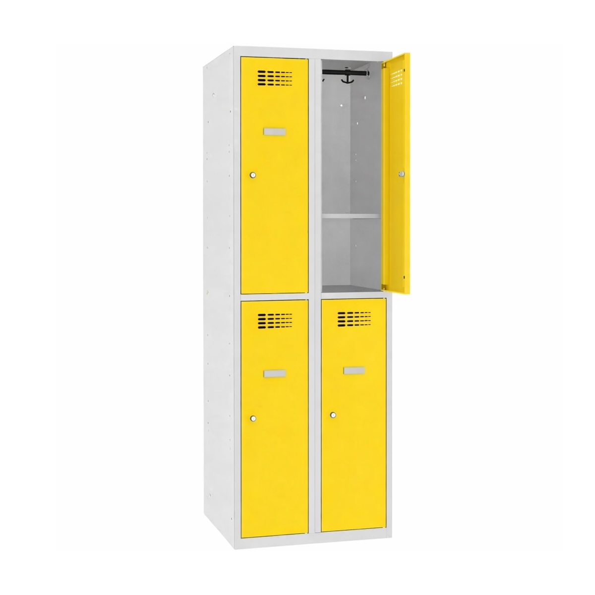 Każdy moduł wyposażony jest w drążek PCV z dwoma podwójnymi haczykami oraz praktyczną półkę poziomą, co umożliwia wygodne rozdzielenie odzieży i obuwia. Wzmocnione drzwi z otworami wentylacyjnymi zapewniają odpowiednią cyrkulację powietrza, ograniczając gromadzenie wilgoci wewnątrz komory.