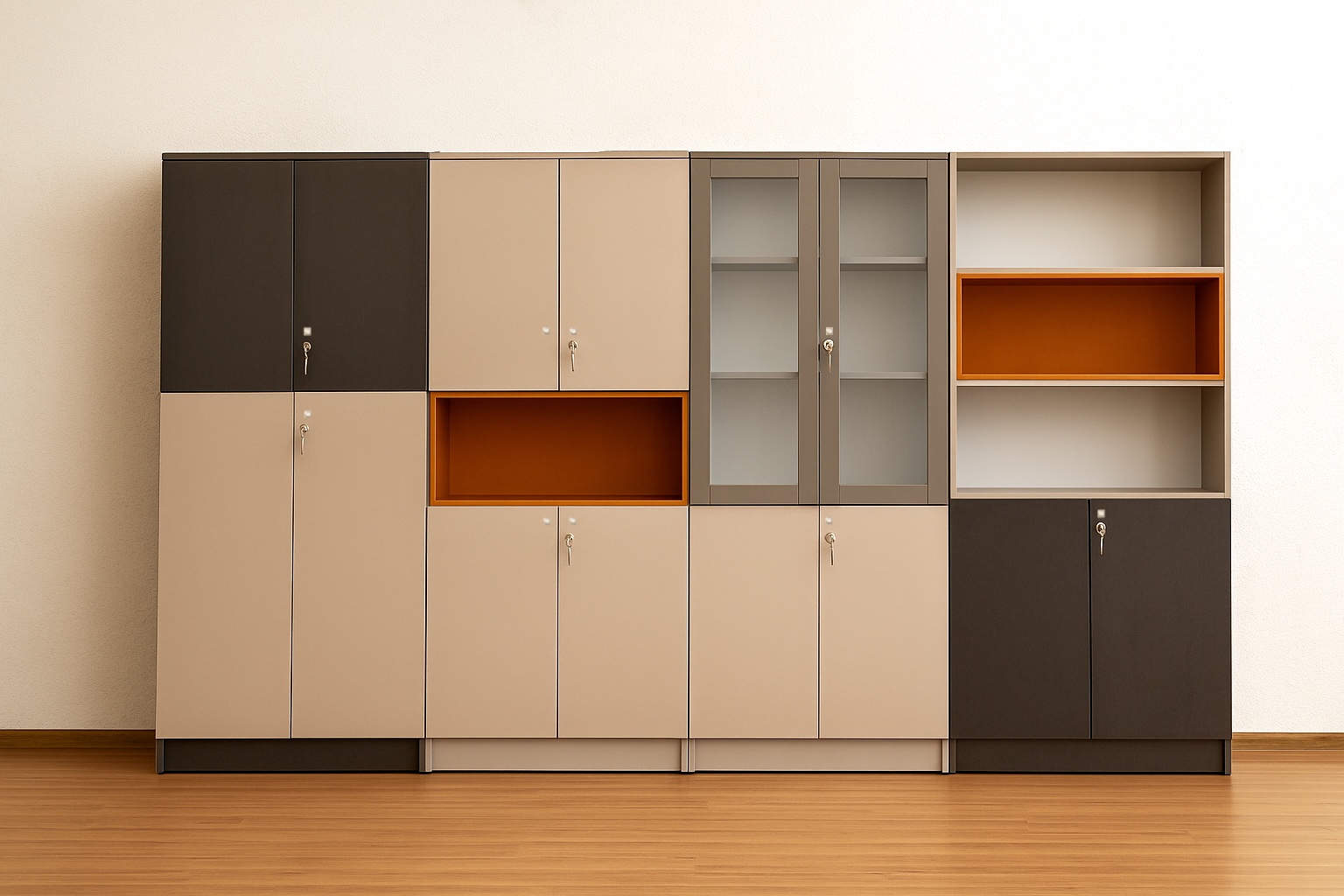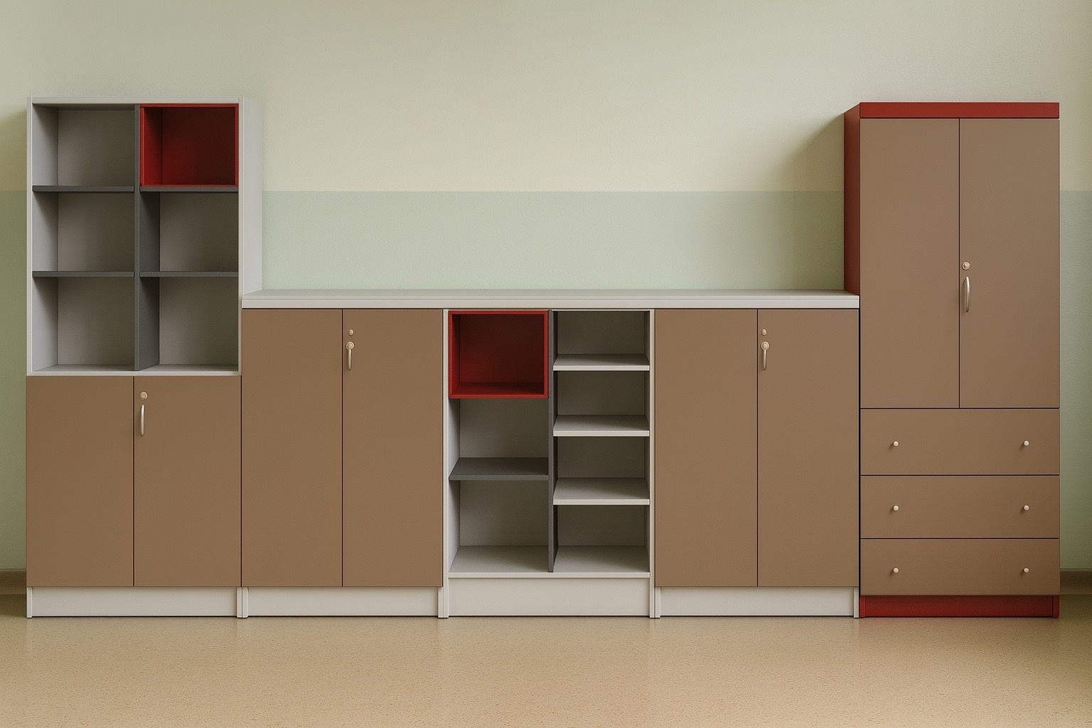 System GLOBUS dostępny jest w wielu wariantach kolorystycznych – od stonowanych beży, szarości i czerni, po energetyczne akcenty w kolorze pomarańczowym. Dzięki temu można stworzyć zarówno spokojne, neutralne wnętrze sprzyjające nauce, jak i bardziej dynamiczne aranżacje, które ożywią przestrzeń szkolną. Połączenie kontrastowych frontów i otwartych półek z kolorowymi wnękami nadaje meblom nowoczesny, przyjazny charakter.