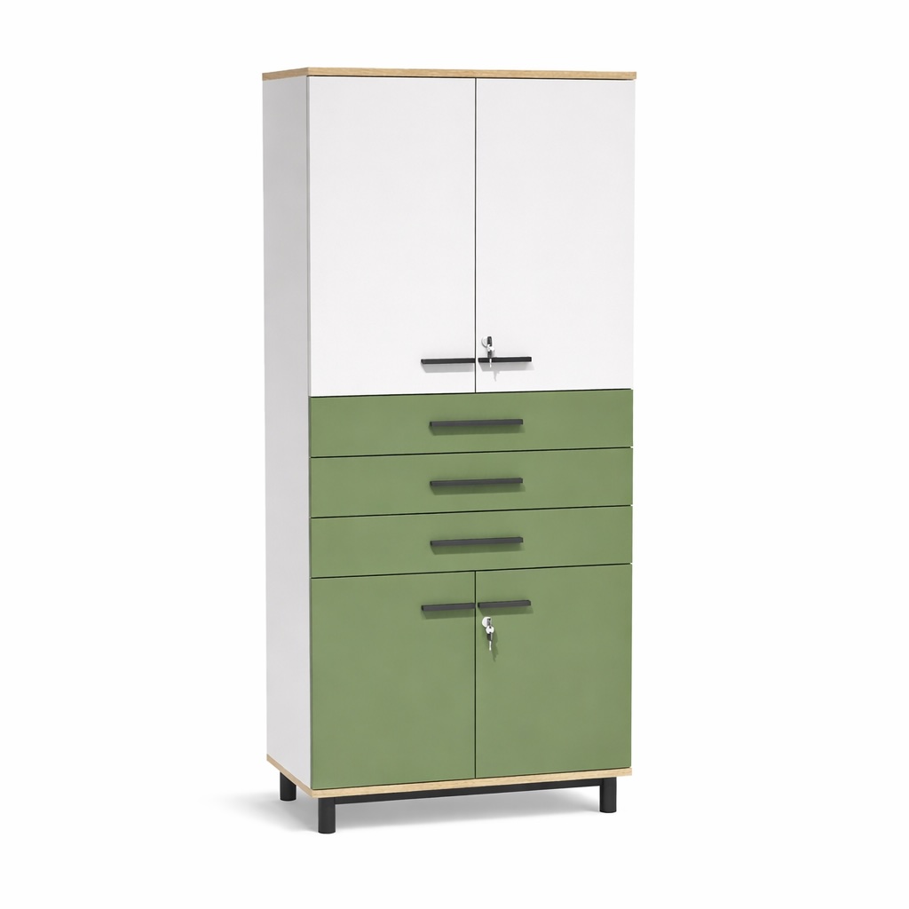 Szafa łączy przestrzeń zamykaną z praktycznymi szufladami, dzięki czemu umożliwia wygodne segregowanie wyposażenia według potrzeb. Zamki w drzwiach zwiększają bezpieczeństwo przechowywanych rzeczy, co ma znaczenie w środowisku szkolnym.