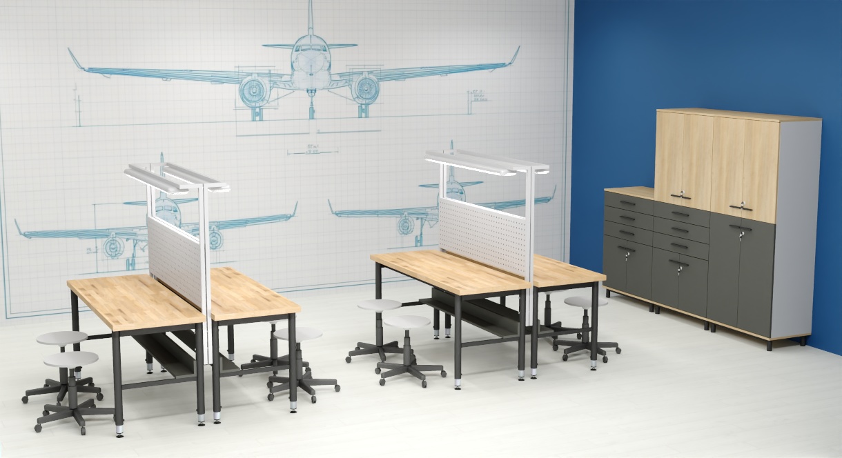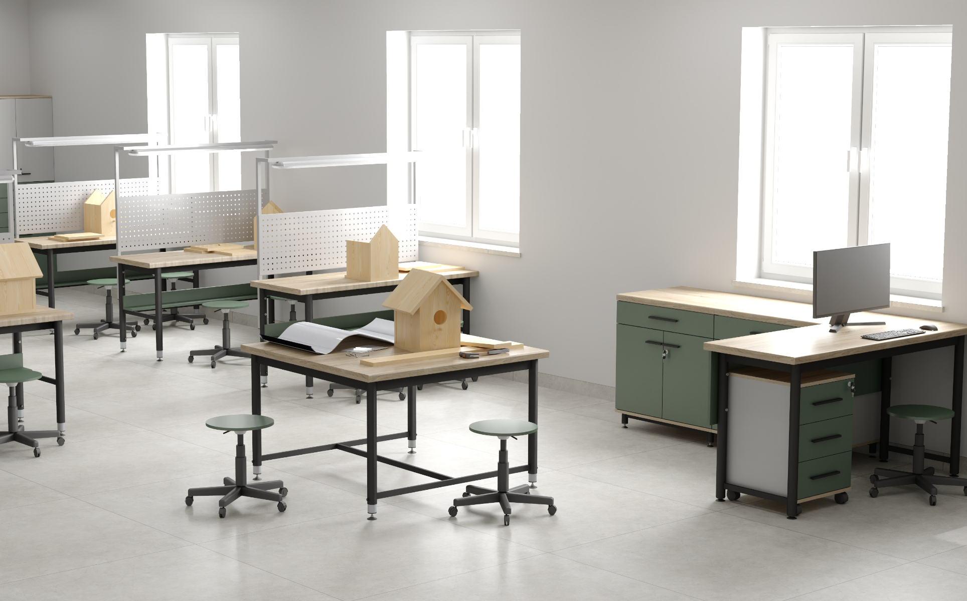 Szafka z szufladami zaprojektowana do pracowni techniki jako uzupełnienie stanowiska nauczyciela w ramach programu „Wzorowa Pracownia Techniki”. To praktyczne rozwiązanie do przechowywania narzędzi, materiałów dydaktycznych i wyposażenia, które pozwala utrzymać porządek i dobrą organizację pracy.